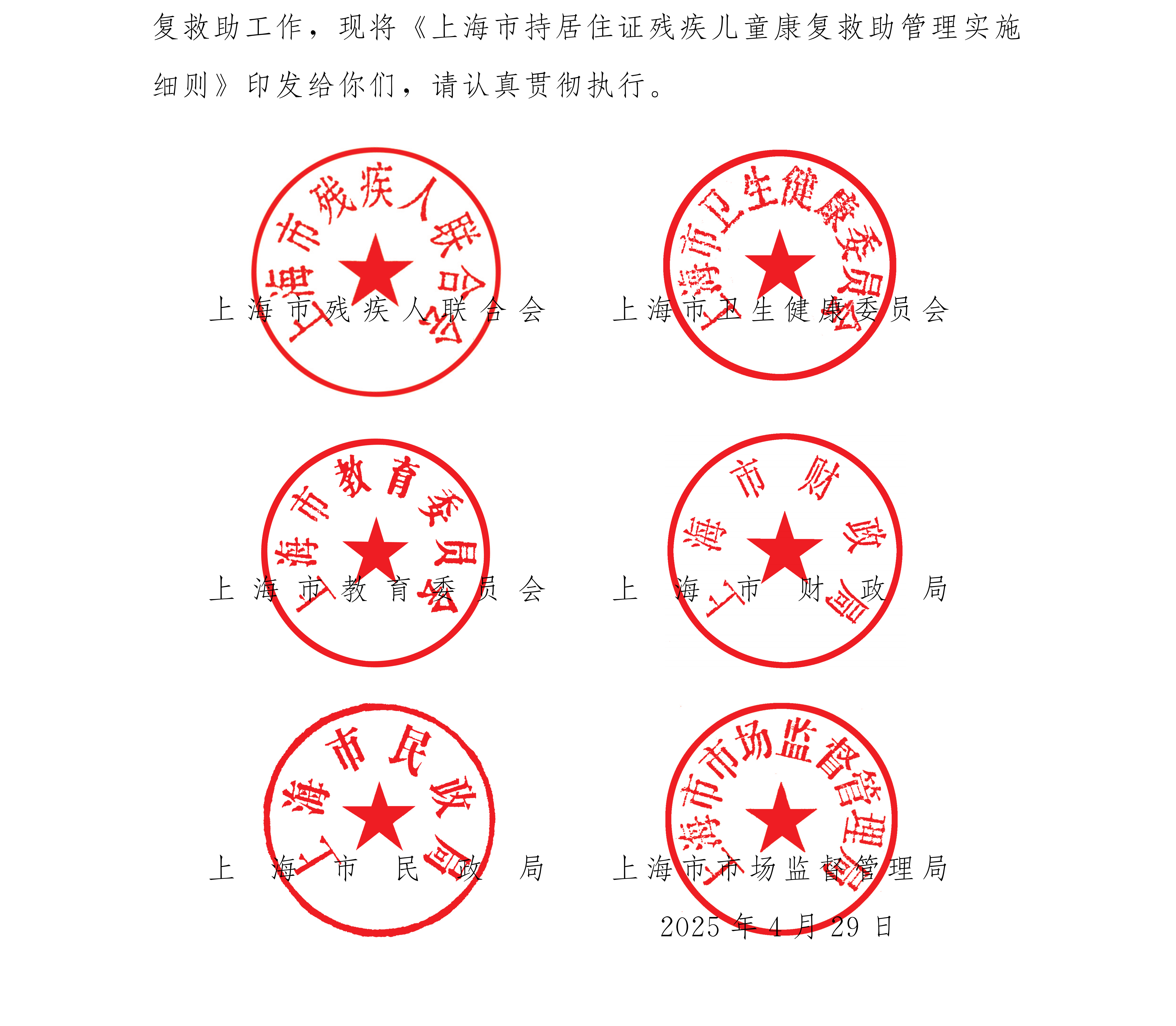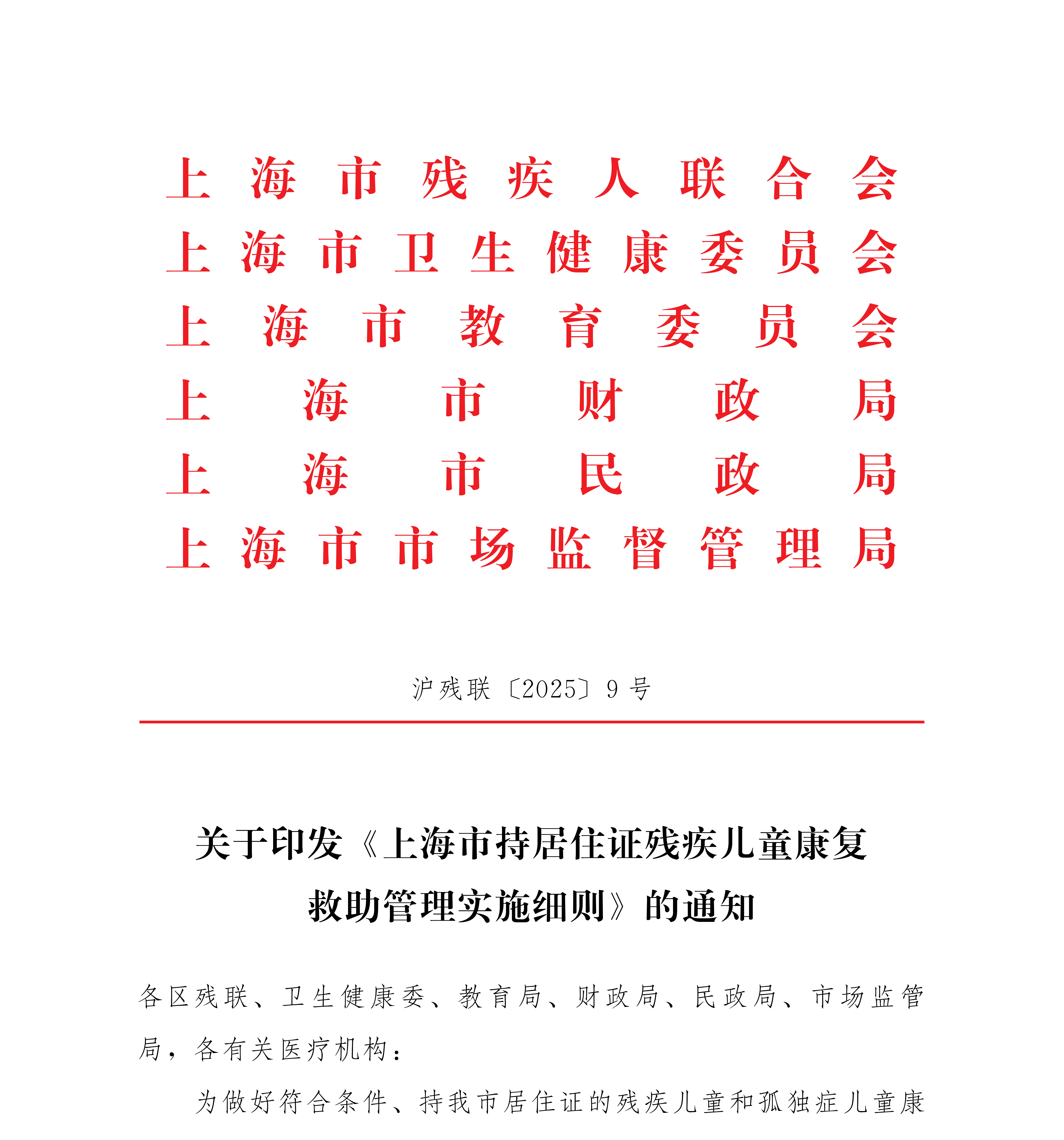 根据《上海市人民政府关于加强上海市残疾儿童康复救助制度建设的实施意见》 (沪府发〔2025〕 1 号) 精神 , 对持我市居住证残疾儿童和孤独症儿童接受康复训练开展救助 , 具体实施细则如下 :