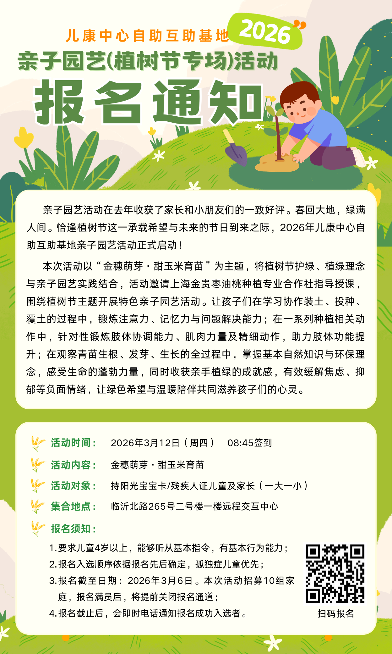 【招募通知】2026年儿康中心自助互助基地亲子园艺(植树节专场)活动报名通知